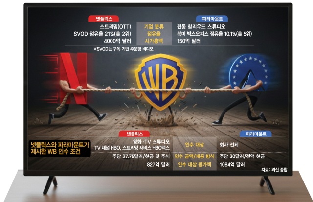 파라마운트가 매긴 워너브러더스의 기업가치(부채 포함)는 총 1084억 달러(약 159조 5600억 원)로 역시 넷플릭스가 매긴 기업가치(827억 달러)보다 높다. 또 영화·TV 스튜디오, TV 채널(HBO), 스트리밍 서비스(HBO 맥스) 등 사업 일부만 인수하기로 한 넷플릭스와 달리 파라마운트는 워너브러더스를 통째로 사들인다는 입장이다.