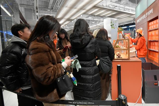 두바이쫀득쿠키(두쫀쿠)를 구매하기 위해 찾은 시민들이 22일 서울 여의도 더현대 지하에서 열린 몬트쿠키 팝업스토어 앞에서 줄을 서고 있다. 임지훈 인턴기자